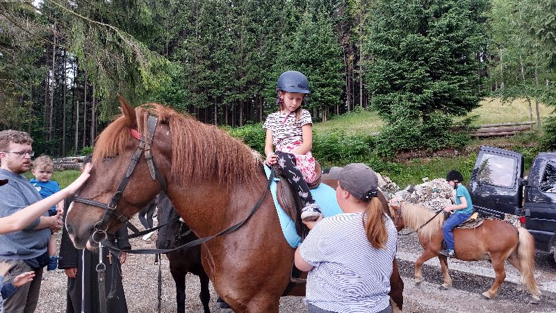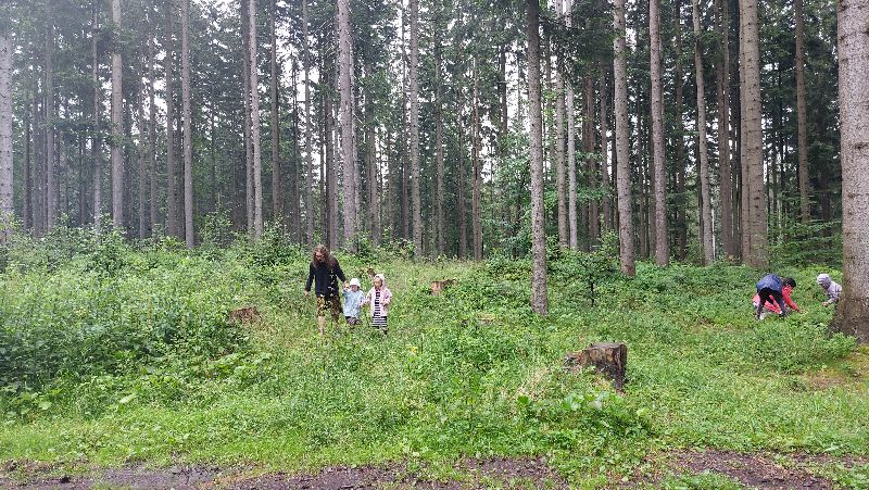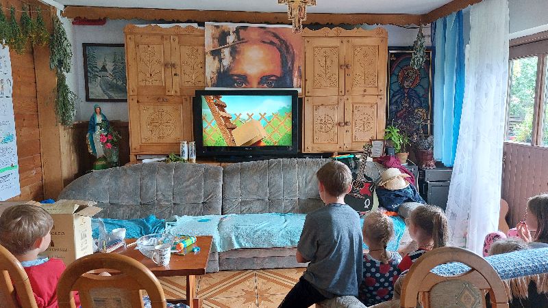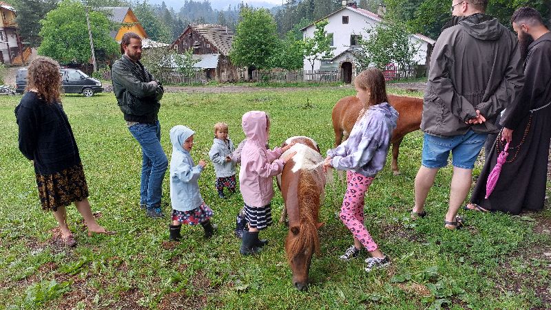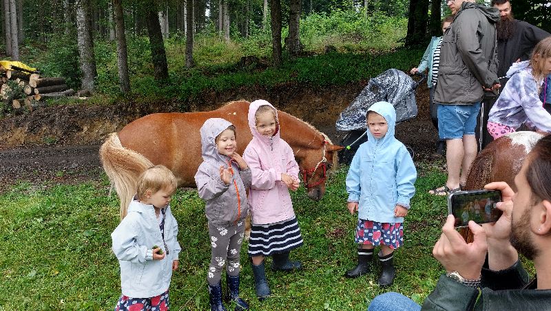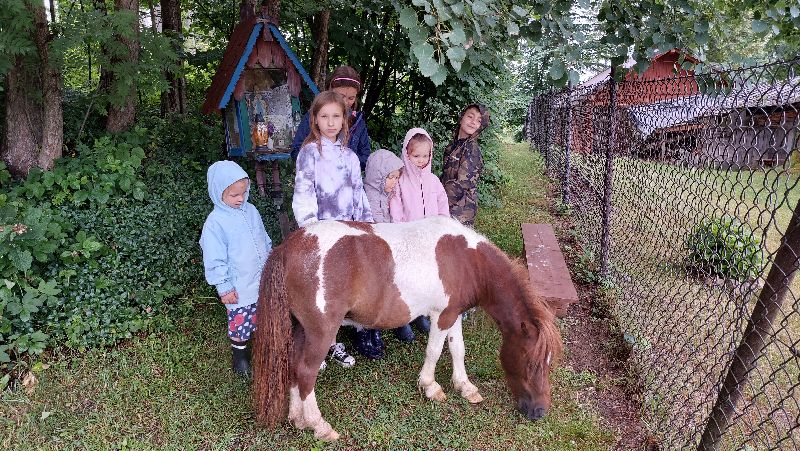We wtorek poranny deszcz pozwolił na obejrzenie w telewizji jedynej bajki, po której wszyscy wyszli na spacer, było spotkanie z kucykiem, modlitwa przy kapliczce, grzybobranie, zbieranie jagód i poziomek.