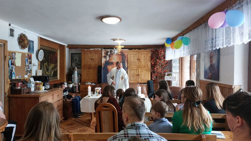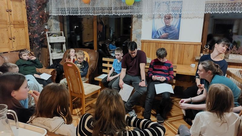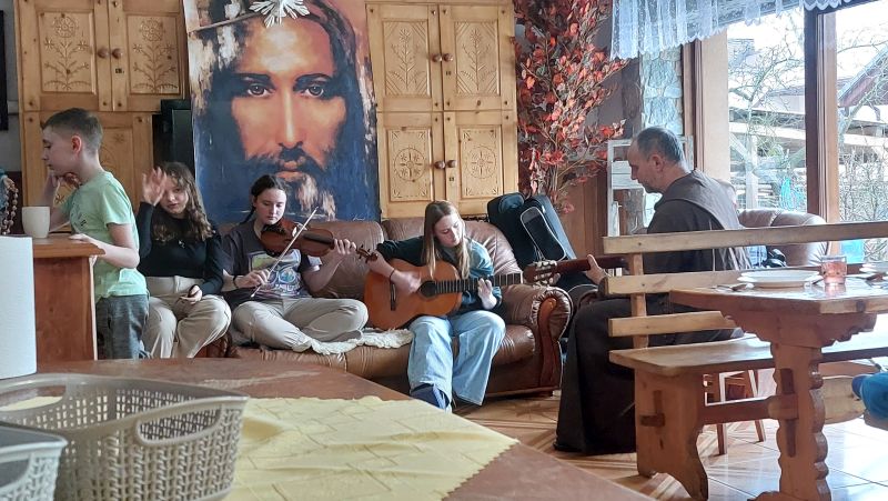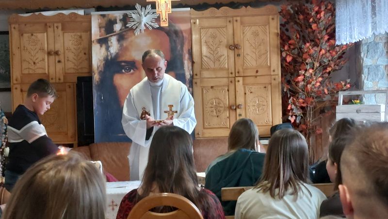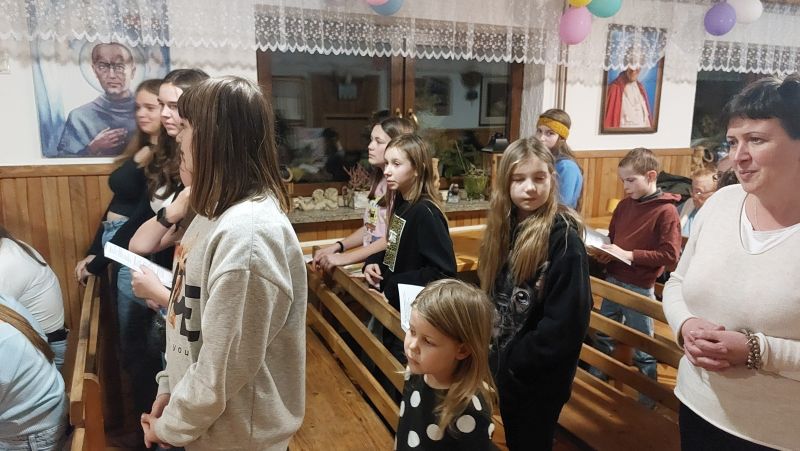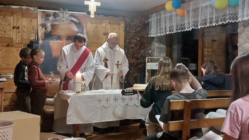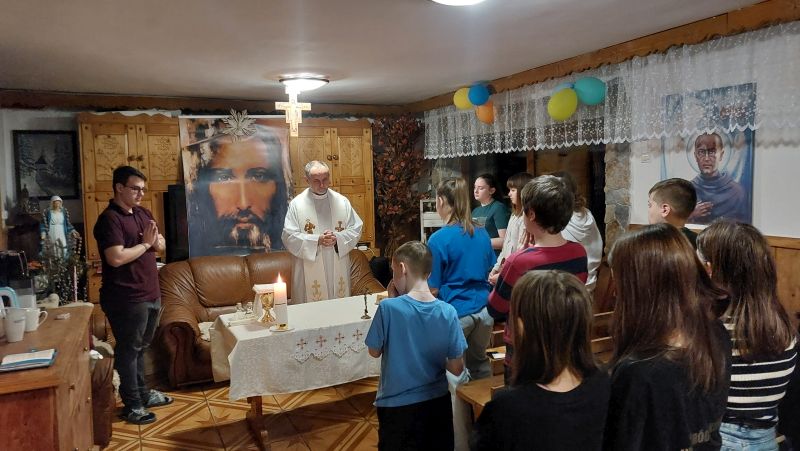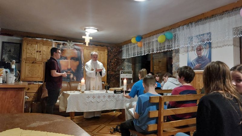 I co dalej? Codziennie spotykamy się razem o 15:00 godzinie, by zaśpiewać Koronkę do Bożego Miłosierdzia. Wieczorem bierzemy udział we wspólnej Mszy Świętej, więc najpierw wspólnie robimy przemeblowanie jadalni, chłopcy ustalają z kapłanem dyżury ministranckie, a uzdolniona muzycznie młodzież przygotowuje oprawę muzyczną przy akompaniamencie gitar i skrzypiec. Późnym wieczorem przed snem razem odmawiamy różaniec. Tym razem i dzieci, i młodzież zdecydowały się zawierzyć Matce Bożej aktem oddania Niepokalanemu Poczęciu.